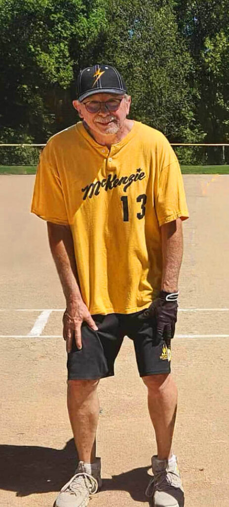 Charlie Howard is so committed to playing senior softball, he leaves Salem at 6:30am on Mondays and Wednesday to play in Clackamas. He plays on the McKenzie rec team on Mondays and manages and plays on a team in the Wednesday competitive division. Howard is tall and rangy with a friendly demeanor that keeps the bench lively. He remains a solid fielder and still hits the ball with authority, all despite two knee replacements. He is just one of many senior players who have had various “parts” upgraded and still keep playing.